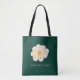 Discover timeless elegance with this **white camellia tote bag** on deep green canvas. The delicate camellia flower blooms gracefully against rich forest green, blending botanical artistry with everyday sophistication.