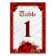 Gör din bröllopsdag bord till din elegant bäst med vackra röd ros. Ro skönhet framhävs av guld filigree och rödmetallisk ram kring vit satin för en lyxkänsla. Bordsnumret står ut med en kompletterande burgig text.