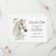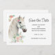 Spara datumkortet med en magisk illustration av ett vackert, vitt häst. Omgiven av söta små rosa blommor. Boho elegant vibe för hästälskare.