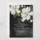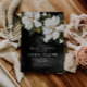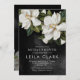 En Elegant Inbjudningskort för möhippan designad med en vit Magnolia-illustration på svart bakgrund. Matcha objekt i vår butik Cava Party Design