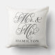 Elegantens fyrkantiga accentkudde för lycklig par och nylweds har ett mjukt svart skript, Mr. och Mrs. design med anpassningsbar monogramtext som kan vara personlig med det gifta efternamnet. Den vita bakgrunden färg kan anpassas så att den stämmer överens med ditt hem- eller sovrumsskår färger.