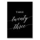 Den här eleganten vit på svart kalligrafi bord 23-bordsnummer är perfekt för ett enkelt bröllop. Neutraltens utformning har ett minimalistiskt kort som är dekorerat med romantisk och visuell typografi. Kortet skrivs ut på framsidan och baksidan (dubblan). Andra bordsnummer i samlingen säljs separat.