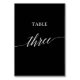 Den här eleganten vit på svart kalligrafi bord tre-bordsnumret är perfekt för ett enkelt bröllop. Neutraltens utformning har ett minimalistiskt kort som är dekorerat med romantisk och visuell typografi. Kortet skrivs ut på framsidan och baksidan (dubblan). Andra bordsnummer i samlingen säljs separat.