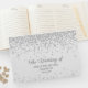 Elegant vit guestbook med silver diamant glitter, personlig med parets datum namn och bröllop.