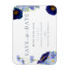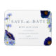 Vackra eleganter målade vattenfärgade sommarblommor i marinblått, kornblomsblått, lila, grönt och gult-nyans, bröllop spara datum-kort. Blommor som kosmos, kornblommor, poppies och glöm mig inte med bladverk. Enkel att använda mall med moderna typografiskript för elegant. Perfekt för en unik blommigt botanisk marinblått temat sommar eller vår bröllop. Unik originalteckning av konstnären Catherine Sweetman. Matchande bröllop-förråd finns i den moderna vildblommans blå bröllop-svit.