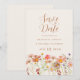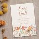 Boho Fall Wildbloms Meadow Bröllop spara datum, en vacker blandning av autumnal charm och bohemisk elegans. Med den ursprungliga blommigten av vattenfärg från Catherine Sweetman visar den här designen handmålade vilda blommor i en levande ängsskugga, med en rik, en jordisk palett av bränd orange, terracotta, persika, plommon, korall, mjuk rosa och guldfärgad gult som fångar essensen av fallande sommar eller vår i fullt-blomman. Viktiga blommigtar och med elegant skapar modern typografi en varm, romantisk ton, perfekt för att tillkännage din stora dag. Anpassa enkelt mallen med namn, speciell dag till ge till dina gäster och en oförglömlig första glimt av firande till kom.