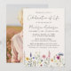 Vänner och familj i inbjudan för att fira livet för din älskade med Eleganten Wildblomma Photo Firande från livets begravningsinbjudan. Designen innehåller ett handskrivet svart skript med viktiga händelsedetaljer nedan i serieskrift. En vacker skugga av vildblommor med vattenfärg och bladlinje grund i formgivningen i vibrerande nyanser av rosa, gult, lila, blått och grönt som kontrasterar mot en ljusgräddbakgrund. Inbjudan återgår till visning av ett fullt-utfall-lodrät-foto. Vildblommorna är perfekt för vår och sommarminnesevenemang.