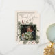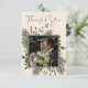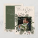 Introducing our enchanting winter wedding photo thank you card, where timeless elegance meets the beauty of the season. The rich ivory cream background, softly distressed with white accents, sets a captivating tone for your special day. In the dark sage green text area, your wedding details stand out, surrounded by a delicate cream frame that adds a touch of refinement. Embrace the spirit of winter with a breathtaking frame of lush greenery, featuring holly adorned with rich red berries, mistletoe with its delicate white berries, and the timeless allure of green pine. Created by Simply Farmhouse Press.