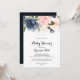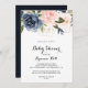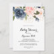 Den här eleganten är kalligrafi-babyduschinbjudan till blommigten på vintern perfekt för en modern babydusch. Utformningen har vackra, handmålade mörk blått, blå, marinerade, rosa, blommor, blommor från guld och blad av grönt, buntade i elegant bouquets.