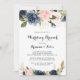 Bröllop brunch-inbjudan i elegant blommigt är perfekt för en modern dag efter att familjen och vänner i bröllop mött brunch. Utformningen har vackra, handmålade mörk blått, blå, marinerade, rosa, blommor, blommor från guld och blad av grönt, buntade i elegant bouquets.
