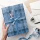 This sophisticated wrapping paper features a layered blue tartan plaid that evokes the cool elegance of a winter landscape. The design beautifully blends varying shades of blue, from deep navy and medium indigo to soft sky blue, all defined by crisp white accent lines. This pattern offers a modern, upscale, and gender-neutral look, making it ideal for winter birthdays, Hanukkah, Christmas, or Father's Day. Choose this chic blue tartan for a refined and memorable gift presentation that stands out from the traditional holiday colors.