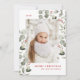 helgdag av elegant med lodräts foto omgiven av röda vattenfärgade skorstensbär, eukalyptus löv och lush sage grönt foliage. Anpassa framsidan av det botaniska julfotokortet med en anpassningsbar hälsning, din familj namn och året med rödbokstäver. Kortet återgår till visning av anpassningsbarnas meddelande med vit text med mörkens bakgrund.
