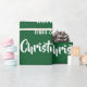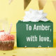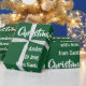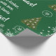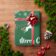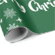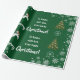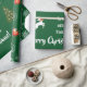 Modern, elegant, and cute Christmas giftwrap with the words "Merry Christmas" in stylish typography, a personalized dedication now reading "To Amber / with love / from Santa," snowflakes, an illustration of a unicorn (with a mane and tail with red and golden glitter) pulling Santa in his sleigh, and a Xmas tree. On a green background with snowflakes.