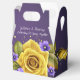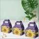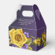 This elegant 50th wedding anniversary favor box features a rich, deep plum-purple background beautifully accented with a stunning oversized golden yellow rose in full bloom. Delicate lavender and violet blossoms are artfully scattered around the rose, adding soft contrast and romantic charm, while subtle golden confetti details bring a celebratory sparkle. The couple’s names and “Celebrating 50 Years Together” appear in graceful white script across the top panel, creating a timeless and refined presentation. Finished in a classic gable-style box with a convenient carry handle, this design perfectly blends sophistication, warmth, and golden anniversary symbolism—making it a lovely keepsake for guests to cherish.