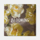 A close-up of golden yellow blossoms against a soft taupe background. The word "BLOOMING" is designed in a stylish, playful font, and you can keep it or adjust it.
