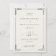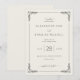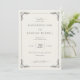Denna eleganta bröllopsinbjudan har en klassisk, vertikalt orienterad layout med gott om vitt utrymme och en ljusbeige bakgrund. Designen inkluderar en invecklad ram med stiliserade bladmotiv i varje hörn, vilket ger en touch av sofistikation. Typografin kombinerar kursiv skrift för personliga detaljer och feta serif-teckensnitt för nyckelinformation, vilket skapar ett tidlöst och formellt uttryck. Perfekt för par som söker en traditionell men ändå raffinerad estetik, sätter denna inbjudan tonen för en minnesvärd fest.