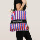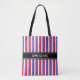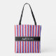 Elegant blå röd vit vertikalrandig handväska. Blå ränder har vitt stjärnmönster. Text kan anpassas. Vackra mode damhandväskor. Shoppingpåsar. Matkassar.