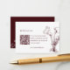 Dela din viktiga bröllopsinformation med lätthet med detta eleganta blomsterdräkta burgundyröda bröllopsdetaljer QR-kodkort. Med rika burgundyröda blommor är detta kort designat för att komplettera din kompletta bröllopsuppsättning. Lägg till en skannbar QR-kod som länkar direkt till din bröllopswebbplats, boende, schema, önskelista eller vägbeskrivning. Helt anpassningsbart och tryckt på premiumkartong, erbjuder detta inklusionskort ett modernt och elegant sätt att hålla dina gäster informerade.