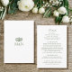 Dessa eleganta inkluderingskort är det perfekta tillskottet till din bröllopsinbjudan, designade för att guida gästerna genom din speciella dag med lätthet. De har parets monograminitialer, klassisk serif-typografi och ett vintage blomster motiv med stiliserade blommor och utsmyckad lövverk. Fullt redigerbara och lätta att anpassa, låter denna mall dig inkludera alla viktiga detaljer, såsom information om mottagningen, boende, transport och din bröllopswebbplats - vilket säkerställer att dina gäster känner sig informerade och välkomna varje steg på vägen. Tryckfärger: matt sagegrön och vit, eller anpassa färgerna för att passa din plan. Utforska den online kollektionen för matchande tryckta mönster!