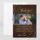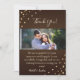 Dela med dig av din tacksamhet med en touch av stjärnbelyst elegans. Detta personliga tackkort har en rik chokladbrun bakgrund som ramas in av glödande, gyllene strängljus och en anpassningsbar fotoram. Med sin sofistikerade skrivstil "Tack" och utrymme för ett hjärtligt meddelande är detta kort perfekt för att tacka gäster för bröllopsgåvor, showerpresenter eller helt enkelt dela din uppskattning under din bröllopsresa.