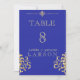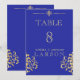 Ett elegant rikt kungligt blått och guld damast bröllopsbordsnummer. Denna inbjudan är en del av en uppsättning.