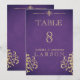 Ett elegant rikt purpur- och gulddamast bröllopsbordsnummer. Denna inbjudan är en del av en uppsättning.