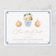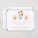 Tidlös "Spara datum"-postkortsdesign med en handmålad blå och vit vas i form av en ingefärsjardinsburk fylld med akvarellblommor. På vardera sidan om denna finns en klassisk orange pumpa. Jag har ställt in mallen för ett bröllops-"Spara datum", men alla textfält är helt flexibla. Förutom blommorna/bladen målades alla akvarellelement ursprungligen för hand av mig innan de skannades till digital form och arrangerades i ett upprepande mönster. Du kan ändra färgen på den grekiska nyckelbordern på framsidan till valfri färg genom att helt enkelt ändra bakgrundsfärgen i designverktyget (klicka/tryck på "personifiera ytterligare" för att komma åt designverktyget).