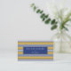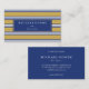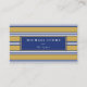 Yrkesmässig visitkort med randar i marinblått, vit och senap.