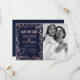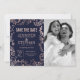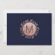 Elegant, modern och chic falsk rose gold och trendig navy blue blommig handritad mönster, Rädda-datum bröllopskort. Denna klassiska och sofistikerade design är perfekt för det trendiga och stiliga paret som gifter sig. Personifiera med ditt eget meddelande på framsidan samt en anpassad monograminitial på baksidan. Allt foto print design.