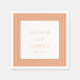 Dessa bröllopsservetter har en minimalistisk och elegant design med en vit rektangulär ram mot vertikala persikofärgade ränder, vilket skapar en subtil övergångseffekt. Typografin är sofistikerad och använder versaler med seriffer för namnen och ett kursivt skript för "och", vilket ger en touch av romantik. Den övergripande stilen är modern och återhållsam, perfekt för en chic och stilfull bröllopsfest. Den mjuka färgpaletten och rena linjer förmedlar en atmosfär av förväntan och glädje, vilket gör dessa servetter idealiska för att fånga speciella ögonblick på er stora dag.