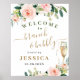 Välkommen gäster till er bröllopsdag med Eleganta Rosa Blommor Boho Bröllopsfest Affisch, med frodig vattenfärg botanisk grönska och vita blommor, med "välkommen till vår lyckliga framtid," era namn och bröllopsdatum i en chic blandning av moderna block- och handskrivna kalligrafiteckensnitt.