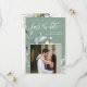Denna spara-datum-inbjudan har eleganta vattenfärgade gröna bladarrangemang och vacker kalligrafi och en enkel typsnittsstil med en fyrkantig fotoram på en salvia grön bakgrund och QR-kod för en ren minimalistisk och modern look, som är ett vackert sätt att informera om din kommande bröllop. Meddela din familj och vänner att ni gifter er med denna inbjudan och lägg till en personlig touch med vackra bilder på dig och din snart blivande bättre hälft. Enkelheten i denna design lägger till en touch av elegans till din bröllop. Det fungerar bra med många bröllopsteman och är definitivt ett bra tillägg till din bröllop. Anpassa bara namnen och formuleringen i några enkla steg och anpassa inbjudningskortet med din foto av det lyckliga paret och byt ut QR-koden med din egen.