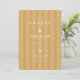 Denna eleganta bröllopsinbjudan har en varm, senapsgul bakgrund med subtila vertikala ränder som ger textur och djup. Designen använder en klassisk serif-teckensnitt för en sofistikerad look, som betonar unionen mellan två individer med gott om utrymme mellan namn och viktiga detaljer. Layouten är ren och välorganiserad, vilket säkerställer tydlighet och läsbarhet samtidigt som den bibehåller en underdriven formalitet. Perfekt för par som söker en tidlös och förfinad estetik, sätter denna inbjudan tonen för en minnesvärd fest.