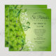 Fina inbjudningar till St. Patrick's Day med massor av shamrock och vita och gröna rullar på en grön gradientbakgrund.