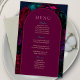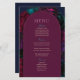 Eleganta smyckeskoncept blommig burgunderfärg marinblå bröllopsmeny. Lägg till en touch av elegans till din mottagning med denna trendiga blommiga bröllopsmeny med smyckeskoncept. Med en sofistikerad palett av burgunderfärg, marinblå, fuchsia, magenta, turkos och lila blommor, kompletterar denna design vackert ett rikt och romantiskt bröllopstema. Den stilrena typografin och det moderna upplägget framhäver varje rätt med grace och klarhet, vilket säkerställer att dina gäster njuter av en smidig middagsupplevelse. Perfekt för höst-, vinter- eller kvällsbröllop, är detta menykort både ett praktiskt och dekorativt tillägg till din dukning.