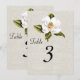 Vacker bröllopsbord nummer skylt med en elfenbensfärgad linne looknande bakgrund. Vackra vintage-målningar av en vit magnoliablomma pryder toppen av kortet, på fram- och baksidan. Svart text är helt anpassningsbar och redo att anpassas för varje bord på er mottagning. Snyggt tillägg till vår Southern Magnolias brölloppsserie.