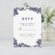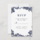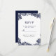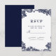 Denna eleganta design har en krispig vit bakgrund med utsökt marinblå falsk spets i hörnen på framsidan. Personalisera RSVP-informationskortet till dina gäster med elegant mörkblå bokstäver och skrivstil. Baksidan av kortet är matchande blått.