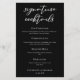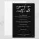Denna eleganta svarta signaturdrinklista har enkel vit typografi med din dryckeslista och ingredienser för din bröllopsbar. En modern, minimalistisk dryckesmeny för en mottagning med old fashioned, cosmopolitan, moscow mule och margarita. Behåll eller byt ut mot din favoritdrink.