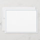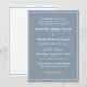 Tidigare års elegans med en modern look kännetecknar denna bröllopsinbjudan i dammig blå och vit. Det är enkelt att ersätta all information med våra platshållare. Kontrasterande moderna teckensnitt inleds med en inbjudan från brudens föräldrar, parets namn och namnen på brudgummens föräldrar - alla i vitt mot en djup dammig blå bakgrund. En silverlig figur skiljer namnen från ceremonidealjerna - i samma teckensnitt och färger. Den nedersta raden kan raderas om du föredrar en separat inbjudan till mottagningen. En vit ram pryder kanterna på det dammiga blå kortet. Färgerna är omvända på baksidan, med vit bakgrund och blå ram. Här finns ett utmärkt utrymme för att inkludera vägbeskrivningar till din lokal eller annan information som du tror dina gäster skulle uppskatta. Vi föreslår vita teckensnitt, men var kreativ och lek med färger om du vill. Bröllopsinbjudningar har utvecklats från "rätt sätt"-traditionen till "ha det som du vill"-friheten