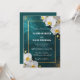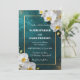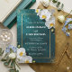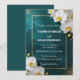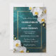 Skapa en stämning av tidlös romantik och modern lyx för din speciella dag med denna fantastiska djupblåa bröllopsinbjudan. Designen har en rik, mörk teal bakgrund som förstärks med en glittrande guldglitter-spray och eleganta vita orkidéblommor. En delikat metallisk guldram avgränsar texten och tillför en touch av högklassig förfining till din bröllopsannons.