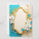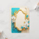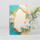 "Slående elegant design med en lyxig utsmyckad guldram centrerad på en sofistikerad tudelad bakgrund av livfulla turkosa och mjuka krämvågor. Vackra vita orkidéer med ömtåliga gula centra blommar bredvid skimrande gyllene palmblad, tealgrönska och kaskaderande pärl- och guldpärlsmycken med gnistrande höjdpunkter.