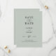Vacker, elegant och enkel grönt av havsglas Spara datumet med vacker kalligrafi och ett modernt svart teckensnitt. Fullt anpassade med namn, datum och mer information på framsidan.