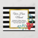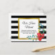 Du kan anpassa svart text med ditt namn och nytt adress. I anpassningsbarna står fält "Vi har Flyttat" ovanför namn och adress. Bakgrunden har svart och vitt vågrät rand. En röd blomma finns i det nedre hörnet. Texten omges av ett faux (inte folie) guld gräns.