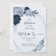 Elegant, blått och dammigt blåa blommor och några vackra löv på ett geometriskt inbjudningskort för möhippan i ram. Närmare uppgifter om glitter simuleras