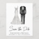Chicens budgetvänliga spara datum meddelande med vattenfärger i en möhippa och en trioms tuxedo och "Spara datum" i ett elegant-skript. Lägg till namn, datum och plats för bröllop i modern typografi. På motsatt sida kan du anpassa spara datum meddelande mer i detalj och lägga till namn i ett namnteckning skript.
