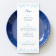 Lägg till lite elegans till din speciella dag med vårt Elegant Blommigt Bow Bröllop-menykort. Det här vackert designade menykortet innehåller delikata blå blommigtar och charmerande flugillustrationer, perfekt för en klassisk och sofistikerad bröllopsmottagning. Den tidslösa blå och vita paletten färg kompletterar alla bröllop-teman och skapar det ett mångsidigt val för din stora dag. Anpassa den med din menyinformation för att skapa en fantastisk keepy för dina gäster. Perfekt för bröllop, möhippor och andra eleganter. Ordna dig nu och höj din bröllop-dekoration med det här menykortet för snyggt och elegant.