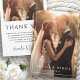 Tack för bröllop-kortet med ett tunt, vitt gräns och parets namn i ett serieteckensnitt för elegant med nedanstående datum. Tack för ytterligare foto och anpassningsbar på baksidan. Svart text på vit bakgrund. Färg och typsnitt kan anpassas.