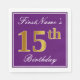 Den här enkla och elegant pappra napkin-designen innehåller ett meddelande som "FirstName's 15 Birthday" (med "15:e" som har en ytliknande guld) inom ett kvadratiskt område av lila färgad med en enkel gräns-kontur. Namn är i en text som liknar en skript med vit färgad och kan anpassas. Napkins som dessa skulle kanske kunna användas i en födelsedagsfest till någon som firar sin femtonde födelsedag. [~Z0000140]