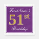 Den här enkla och elegant pappra napkin-designen innehåller ett meddelande som "FirstName's 51st Birthday" (med "51st" som har ett utseende som liknar guld) i ett fyrkantigt område av lila färgad med en enkel kontur av gräns. Namn är i en text som liknar en text med en vit färgad och kan vara personlig. Napkins som dessa kan kanske användas i en födelsedagsfest till någon som firar sin femtioförsta födelsedag. [~Z0000140]
