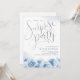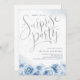 Modern chic faux-skript för "överraskande party" i silver, trendig dammig design av blå blommigt i vattenfärg, elegant och snyggt, underbar vuxen--födelsedagsinbjudan för alla åldrar.